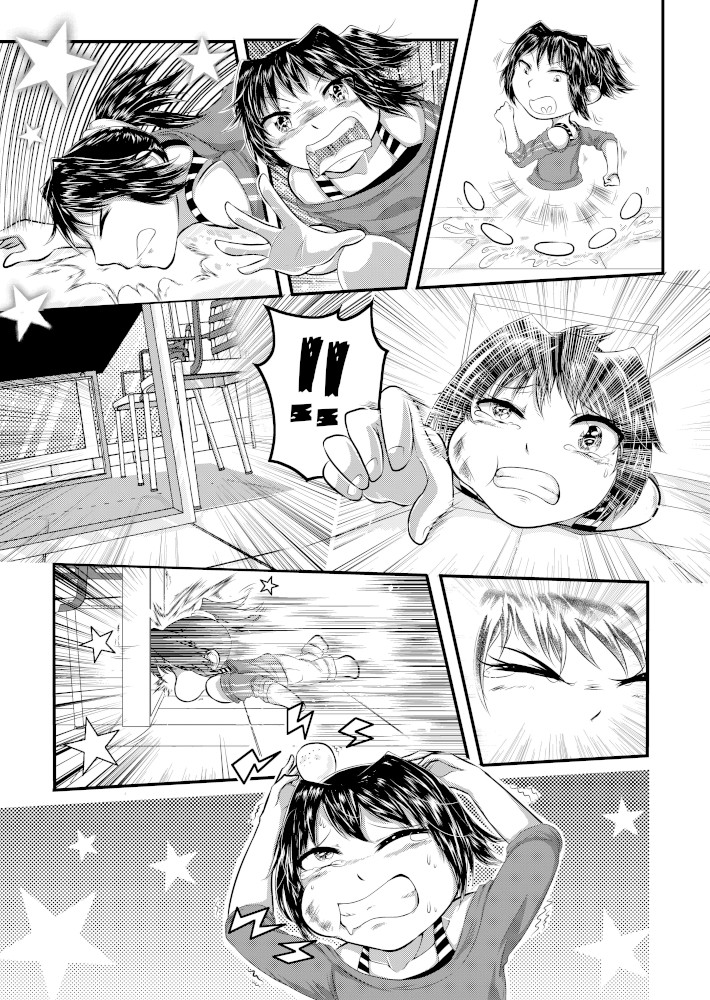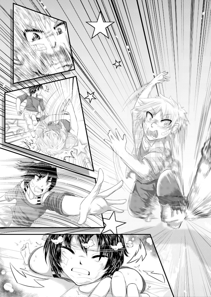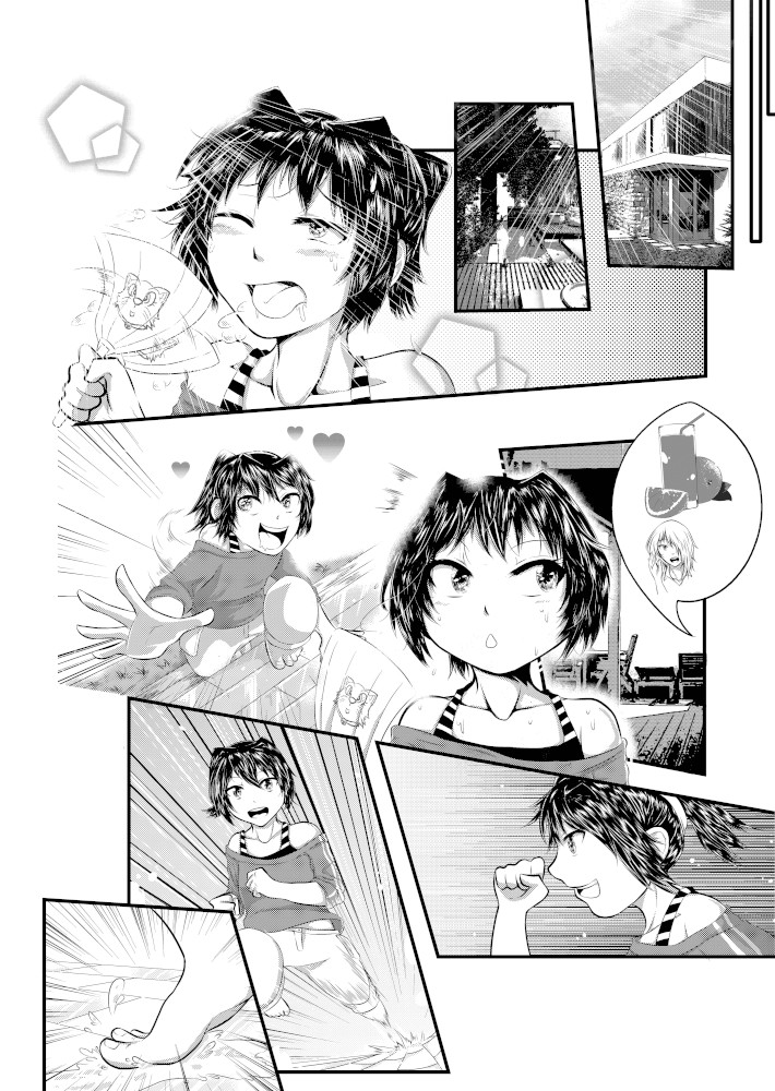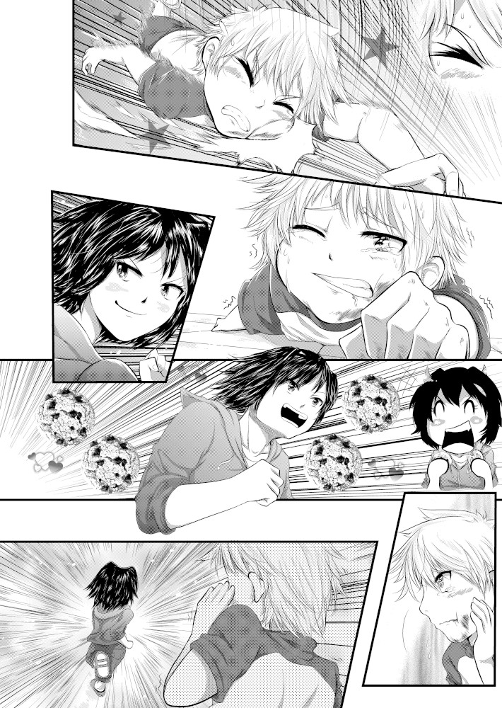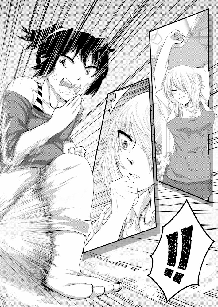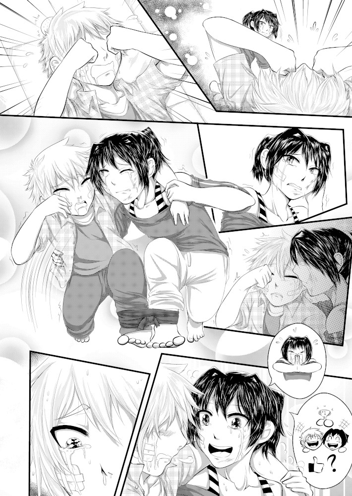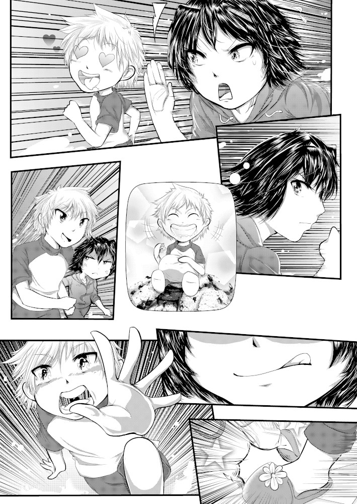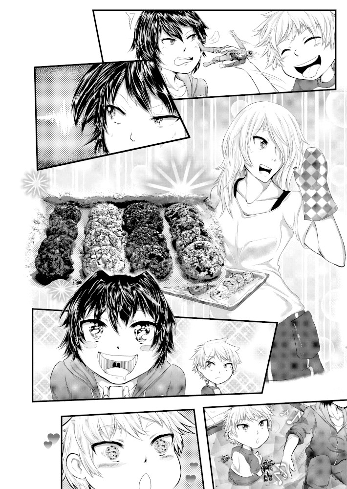 | “It's funny, when I was drawing my manga, I felt like I was looking at my old reflection, since I was 7-10 years old, with my sister. We used to fight each other just for the simplest thing, because we both were rivals at the time. And also we always being scolded by our mom, even though it's useless because we did it over and over. XD So I made this based on my experiences with my little sister. So nostalgic, reminds me the old times since I was a child. I think the double-paged spread is the hardest part of all, because it was the first time for me to draw manga by using 2 pages simultaneously. And I also laugh when I see the children are being tied by their mother, and it's reaction, it's really really got the feeling. Oh yes, here's the name of the characters : 1. Mother - Jenny 2. Girl - Milleva 3. Boy - Jean” | |
