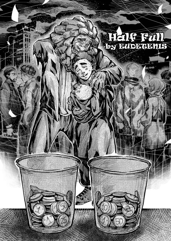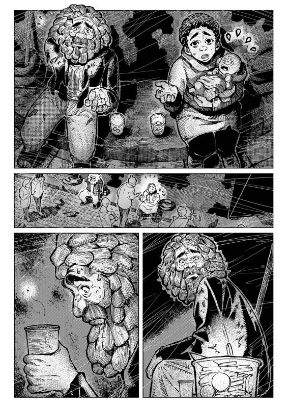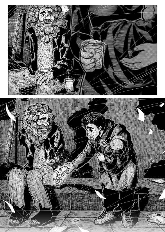 “We know that we're always making stories about people with special needs. But we want to insist on this kind of story when we can cause all of us have to look more to the needs of people around. If you look closer on this comic you can see an entire story happening without common people perceiving that a wonderful thing just happened. Here on Brazil the majority of people are catholic. I, Paulo, am not a religous person, but I like some stories from Jesus, and one of them was my inspiration for this comic, The Widow’s Offering and it says: Jesus sat down opposite the place where the offerings were put and watched the crowd putting their money into the temple treasury. Many rich people threw in large amounts. But a poor widow came and put in two very small copper coins, worth only a few cents. Calling his disciples to him, Jesus said, Truly I tell you, this poor widow has put more into the treasury than all the others. They all gave out of their wealth; but she, out of her poverty, put in everything—all she had to live on. That's exactly the message we wanted to express. It's not how much you give, but how much of what you give from your best. That's why even for short stories like this one(sorry for 39 pages on the last SMA ><) we have a need to give our all.”