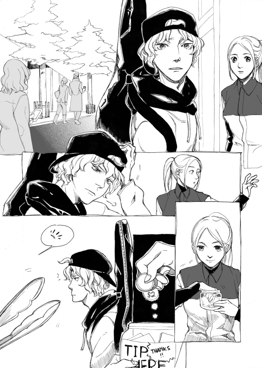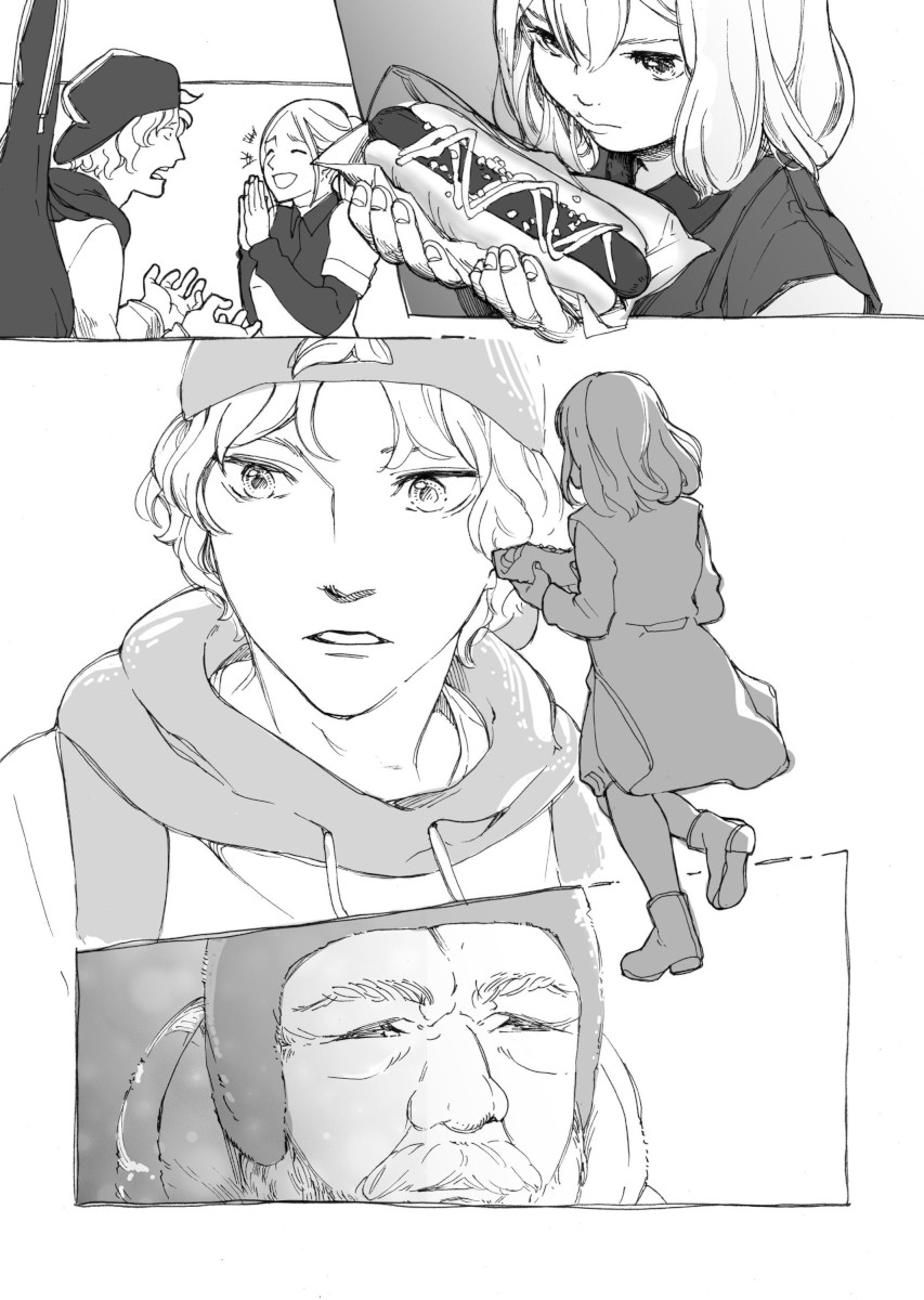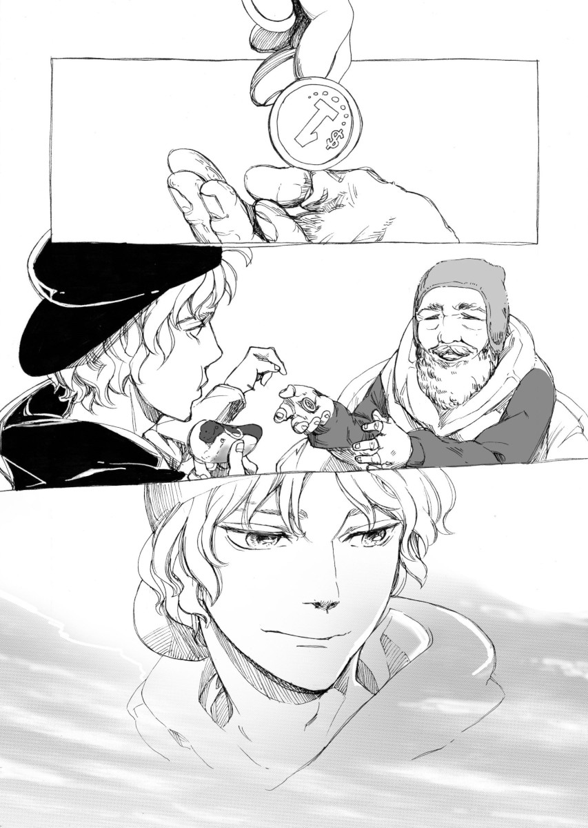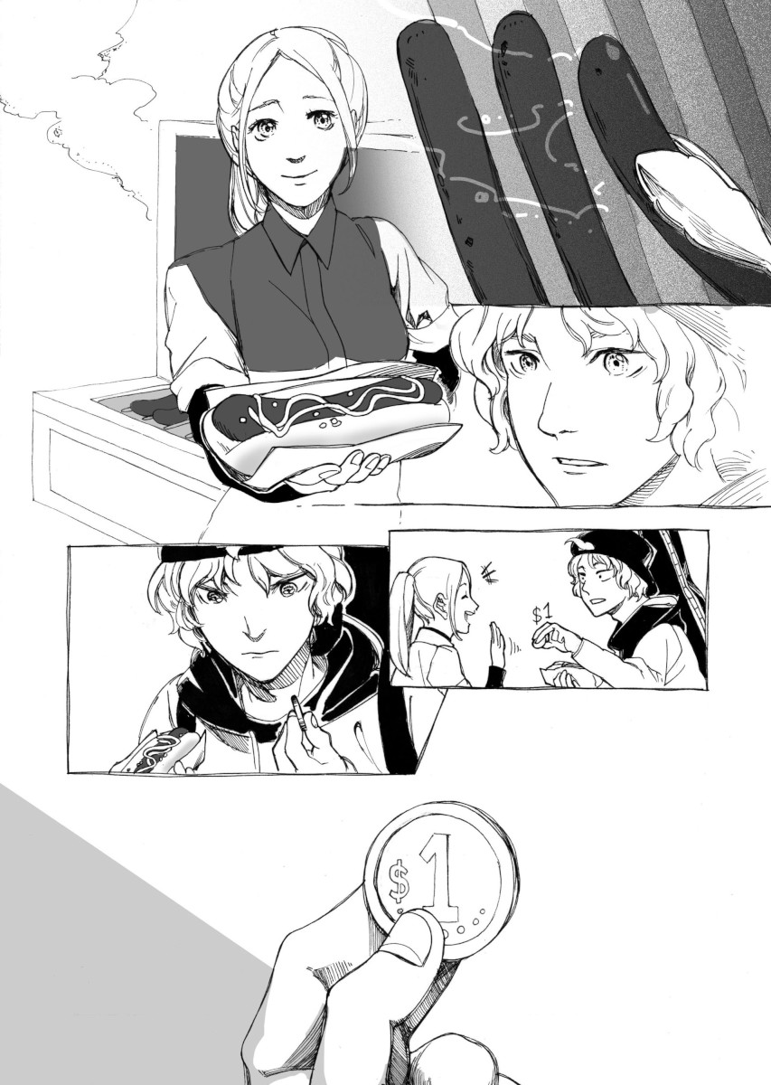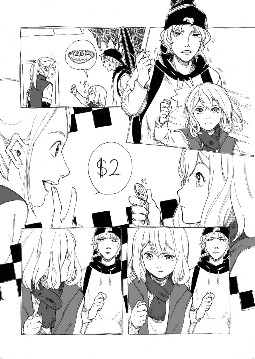 “The fact that the little girl really need a spare of 1 dollar, makes it 2 dollars of her money, to buy a hotdog...not for herself, but for a homeless man. The hotdog seller thinks its unfair for her to trick the boy into giving his 1 dollar to the little girl, decides to give free hotdog for him. And the boy, with the spare 1 dollar left, decided to share it to the homeless man. Fairness for everyone!”