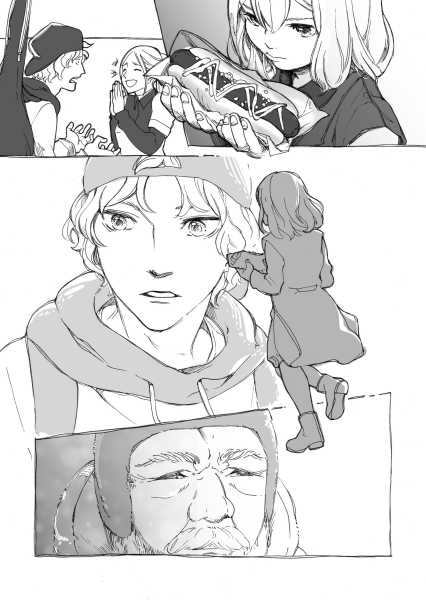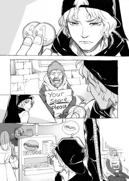 | “The fact that the little girl really need a spare of 1 dollar, makes it 2 dollars of her money, to buy a hotdog...not for herself, but for a homeless man. The hotdog seller thinks its unfair for her to trick the boy into giving his 1 dollar to the little girl, decides to give free hotdog for him. And the boy, with the spare 1 dollar left, decided to share it to the homeless man. Fairness for everyone!” | |