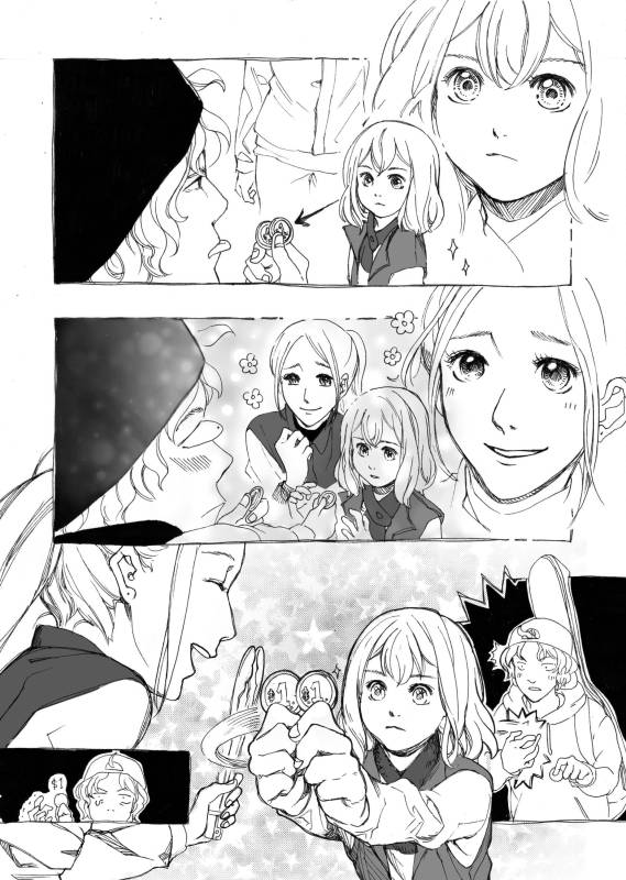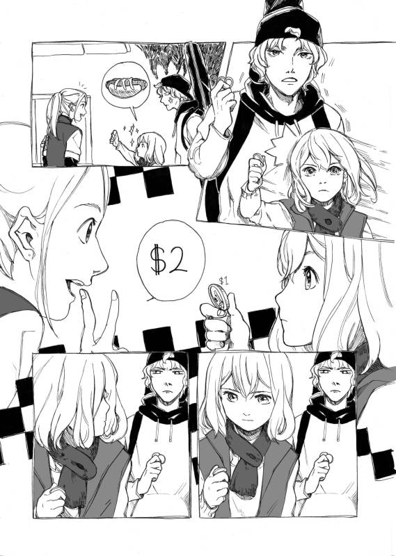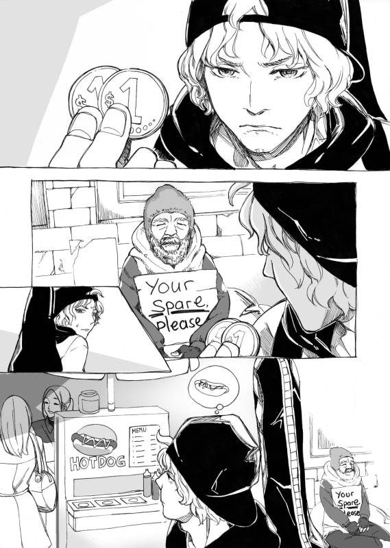 “The fact that the little girl really need a spare of 1 dollar, makes it 2 dollars of her money, to buy a hotdog...not for herself, but for a homeless man. The hotdog seller thinks its unfair for her to trick the boy into giving his 1 dollar to the little girl, decides to give free hotdog for him. And the boy, with the spare 1 dollar left, decided to share it to the homeless man. Fairness for everyone!”