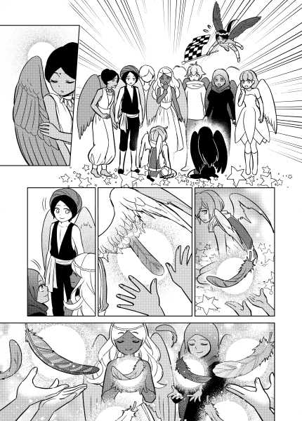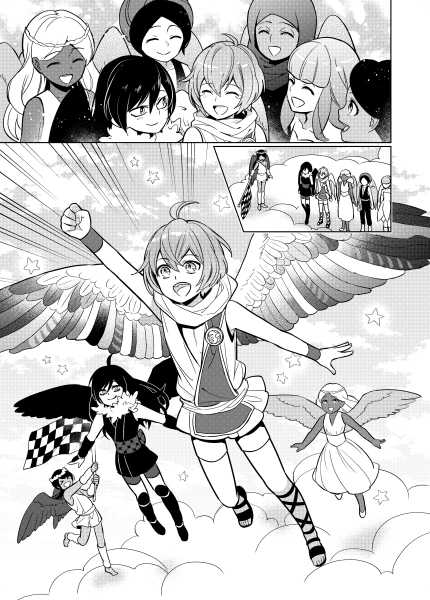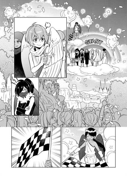 | “星降る空を駆け巡る、飛天たちのレースです。一体何が起こるでしょうか? 最後まで読んで頂けると嬉しいです。制作にあたっては飛天たちの個性にこだわりました。” | |