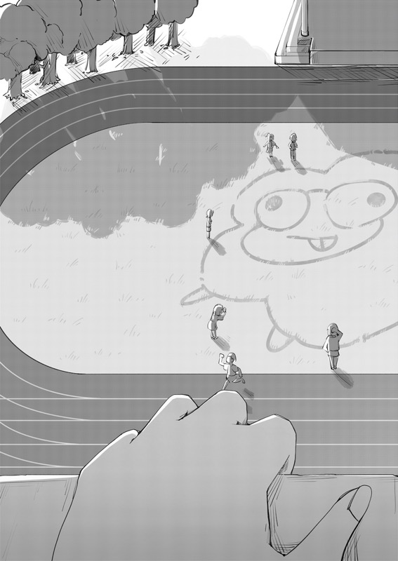 “My favorite part is when the girl is still feeling down because her drawing on the desk got erased. And then, as she looks down at the school field from the hallway, she suddenly sees this HUGE SHEEP pattern on the field!”