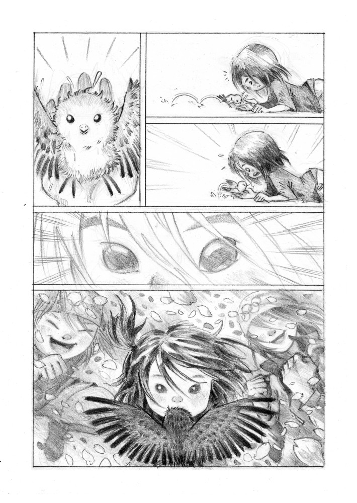| “This is the first time I make a manga entirely in pencil. hb, 2b, 3b, 6b and one erase gum, a great experience! inspiration for storyline comes from my memories of tiny owl that I nurtured 9 years ago” | |