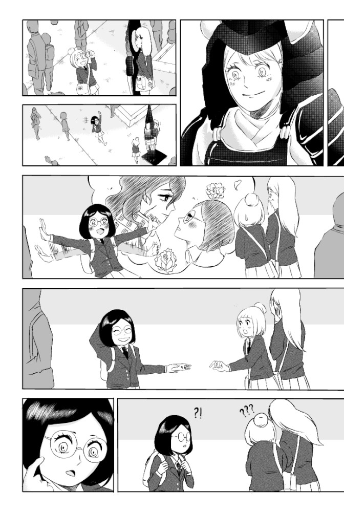 | “The Ikeda Riyoko reference in the 004 page when the young lady tells to her friends as she meets a handsome samurai, she changed the appearence of the him i loved draw that part and of course the final page too that was my favorites parts.” | |
