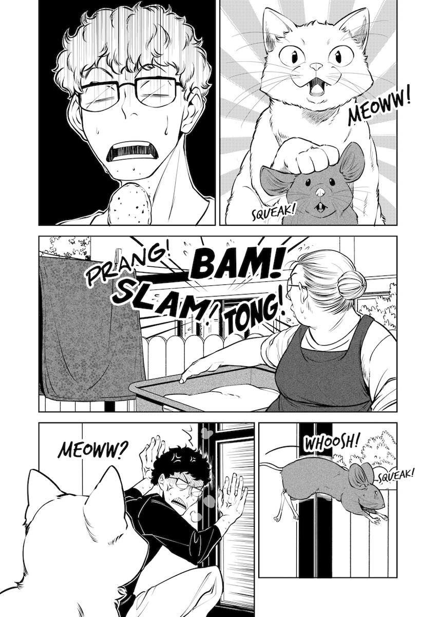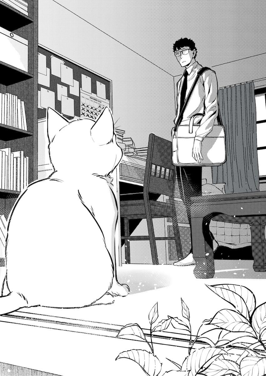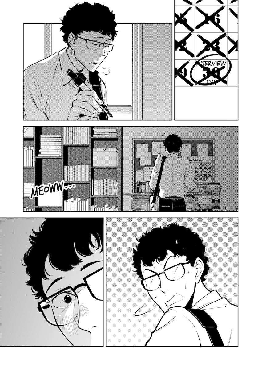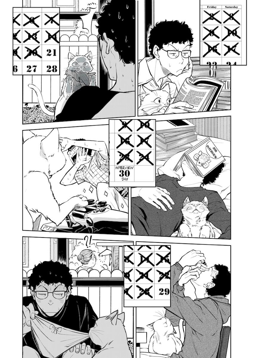 | “The cat trying to give a lucky charm to his owner who's struggle to prepare for job interview.” | |