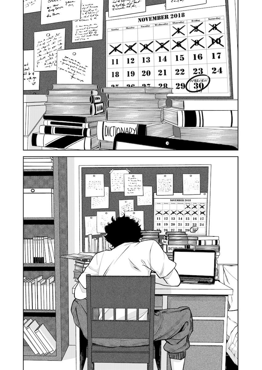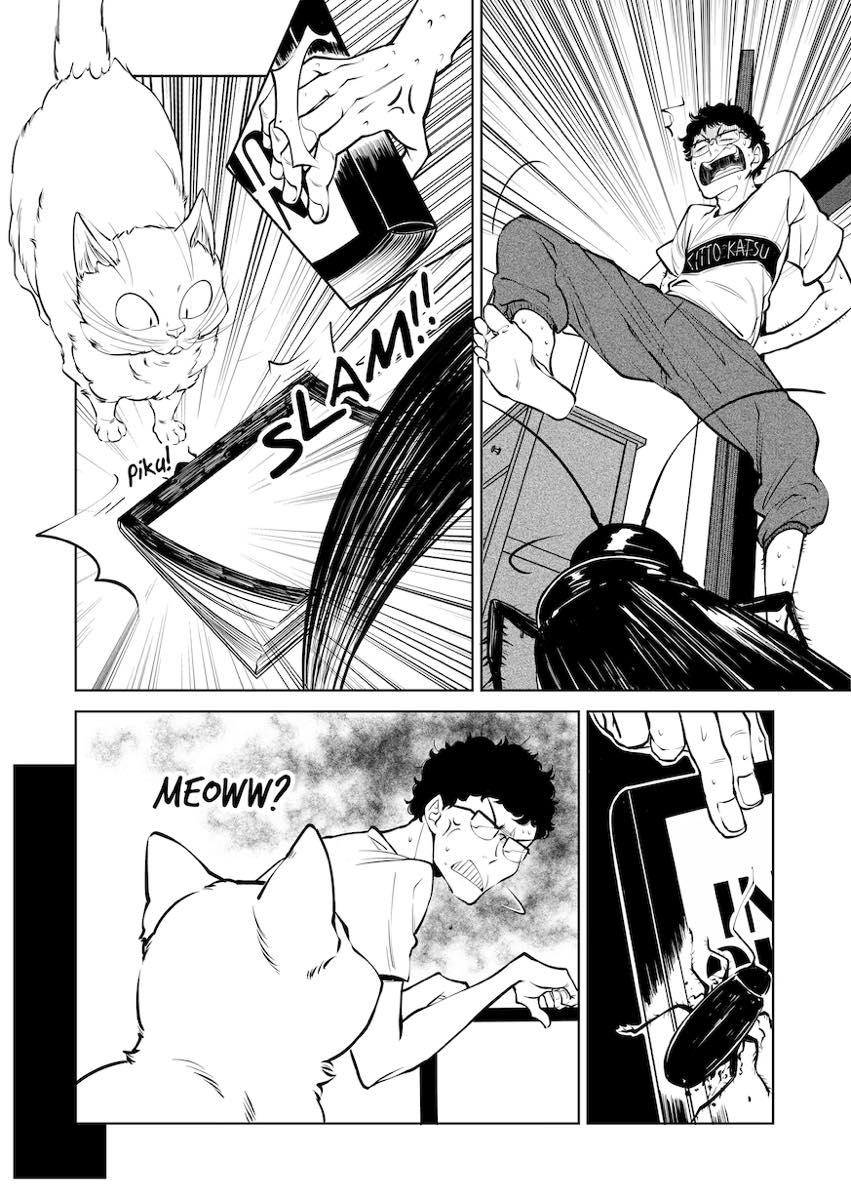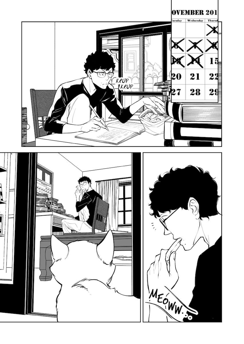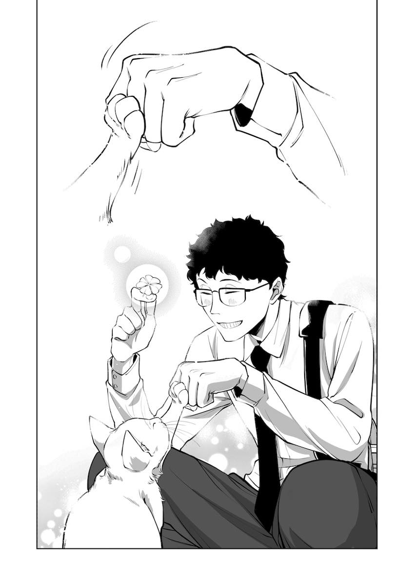 | “The cat trying to give a lucky charm to his owner who's struggle to prepare for job interview.” | |