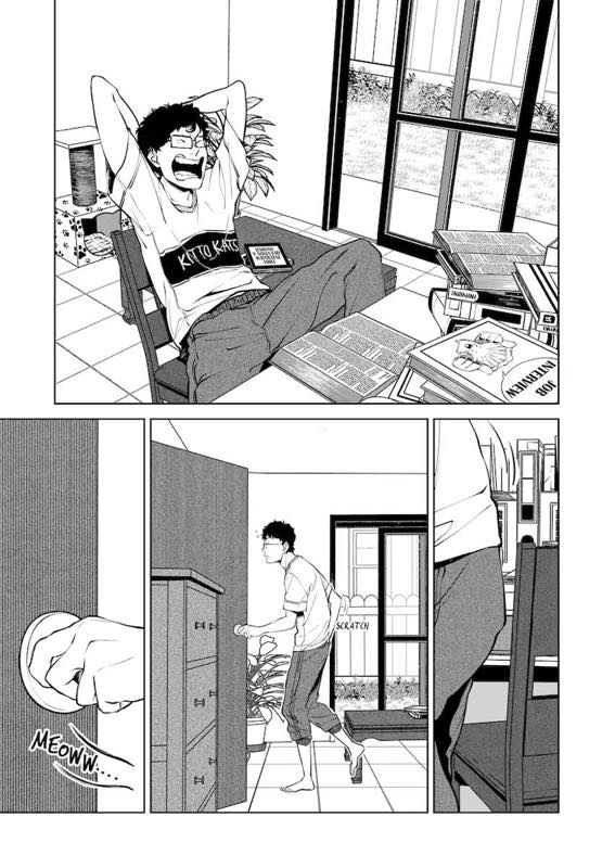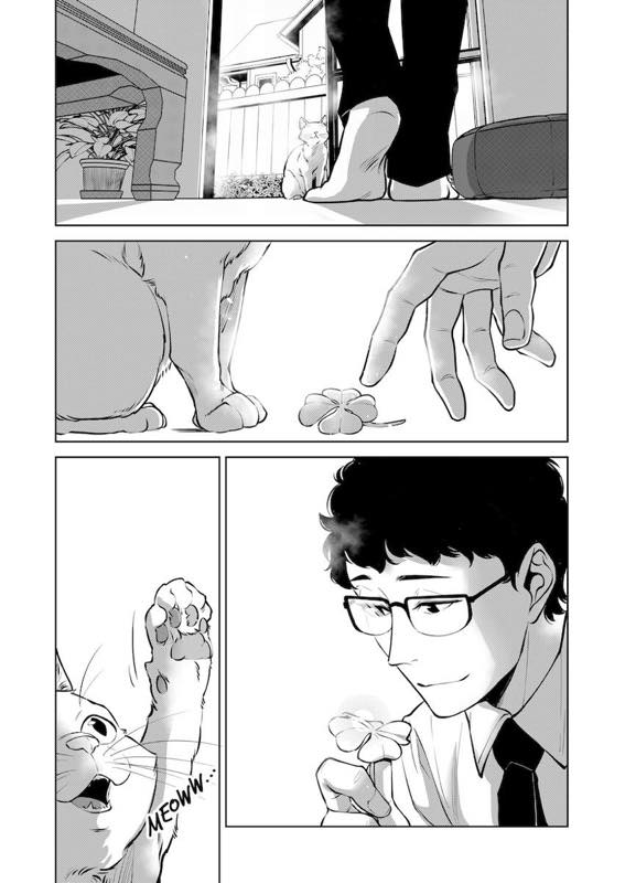 “The cat trying to give a lucky charm to his owner who's struggle to prepare for job interview.”