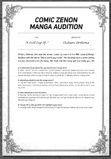 | “Chiharu Oshima, who took the winner runner-up award in the 18th round of Manga Audition with the theme "Warm and fuzzy inside". Her drawings have a warm feeling and her characters are charming. We think that this story will also make you, the readers, feel warm and fuzzy inside!” | |