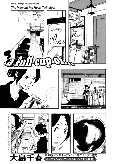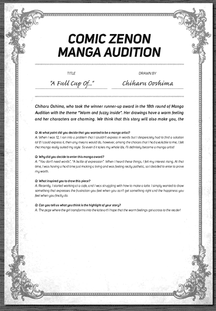 | “Chiharu Oshima, who took the winner runner-up award in the 18th round of Manga Audition with the theme "Warm and fuzzy inside". Her drawings have a warm feeling and her characters are charming. We think that this story will also make you, the readers, feel warm and fuzzy inside!” | |