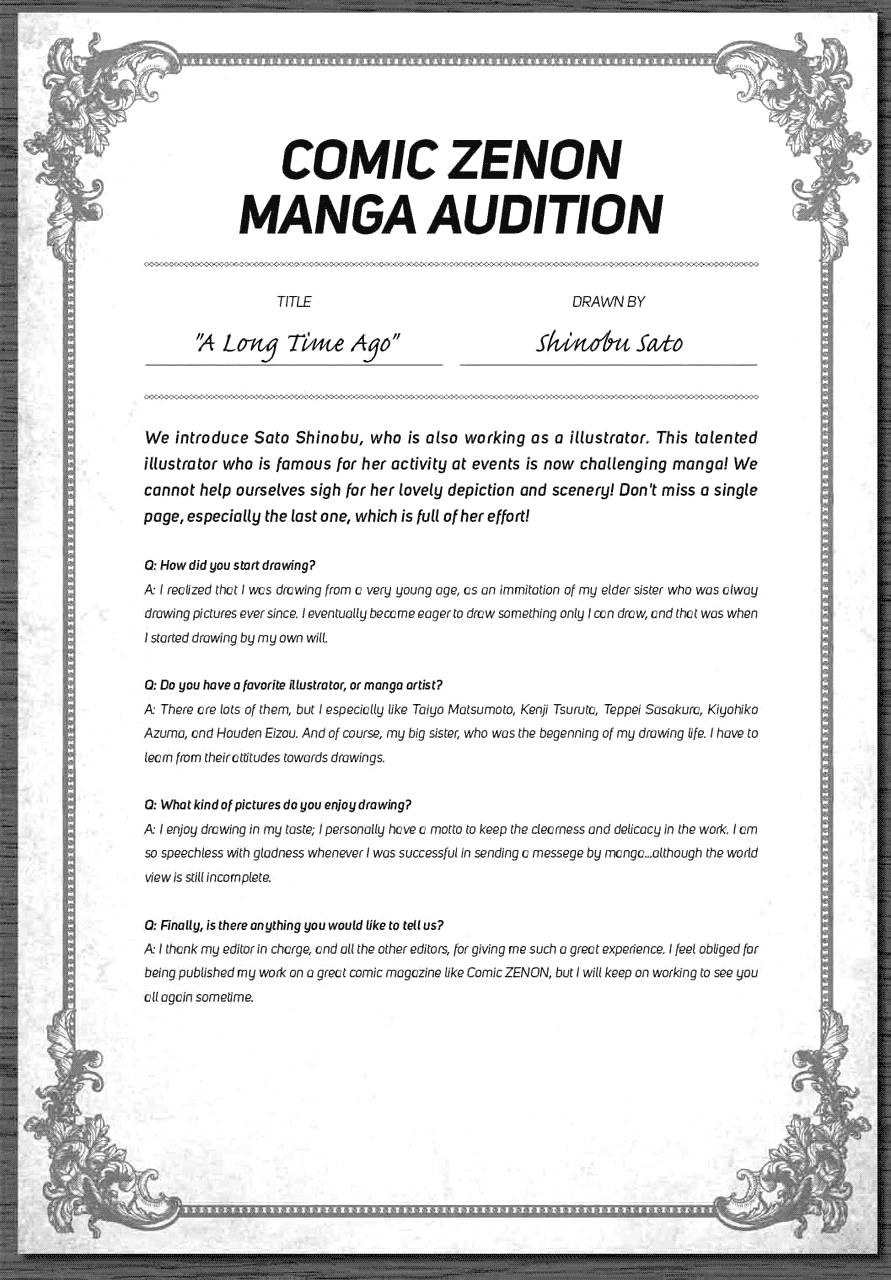 | “I thank my editor in charge, and all the other editors, for giving me such a great experience. I feel obliged for being published my work on a great comic magazine like Comic ZENON, but I will keep on working to see you all again sometime.” | |