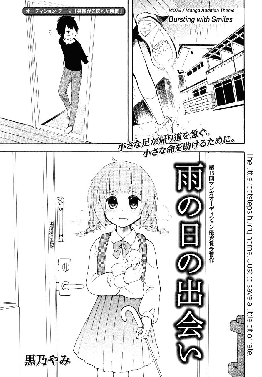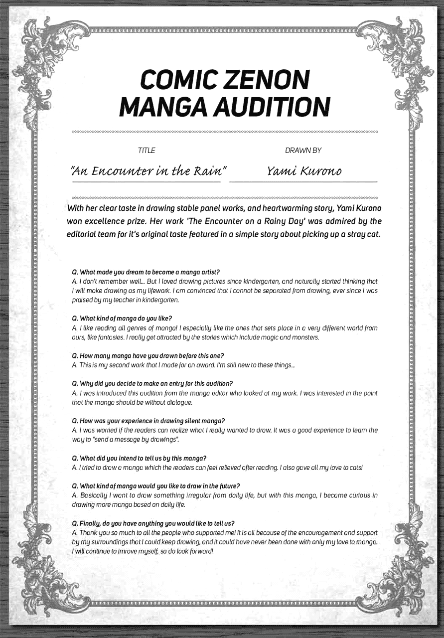 | “With her clear taste in drawing stable panel works, and heartwarming story, Yami Kurono won excellence prize. Her work 'The Encounter on a Rainy Day' was admired by the editorial team for it's original taste featured in a simple story about picking up a stray cat.” | |