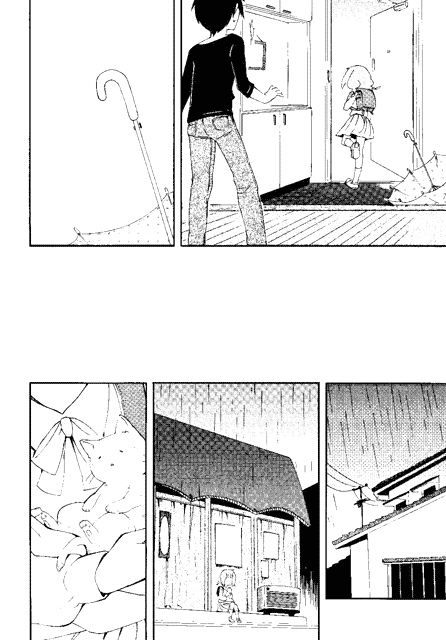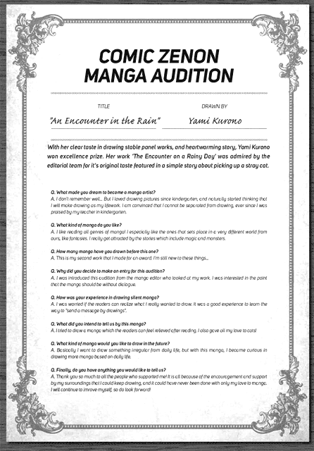 | “With her clear taste in drawing stable panel works, and heartwarming story, Yami Kurono won excellence prize. Her work 'The Encounter on a Rainy Day' was admired by the editorial team for it's original taste featured in a simple story about picking up a stray cat.” | |