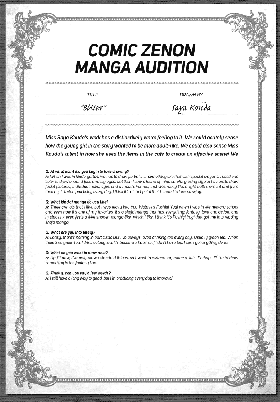| “Miss Saya Kouda's work has a distinctively warm feeling to it. We could acutely sense how the young girl in the story wanted to be more adult-like. We could also sense Miss Kouda's talent in how she used the items in the cafe to create an effective scene! We hope that she'll boldly challenge broader themes in the future!” | |