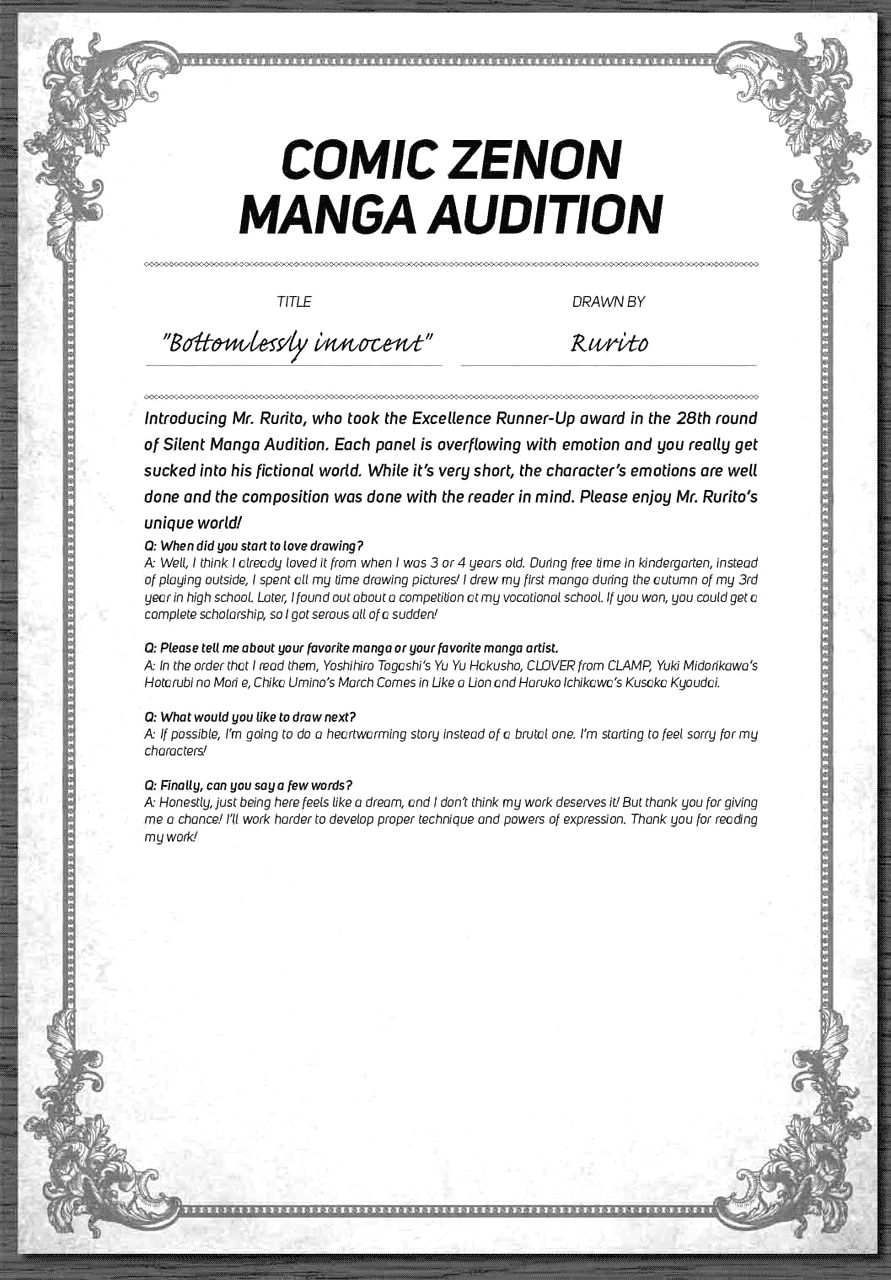 | “Introducing Mr. Rurito, who took the Excellence Runner-Up award in the 28th round of Silent Manga Audition. Each panel is overflowing with emotion and you really get sucked into his fictional world. While it's very short, the character's emotions are well done and the composition was done with the reader in mind. Please enjoy Mr. Rurito's unique world!” | |