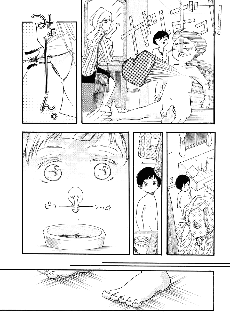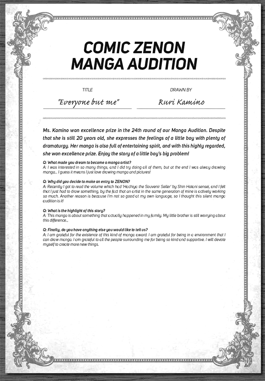 | “Ms. Kamino won excellence prize in the 24th round of our Manga Audition. Despite that she is still 20 years old, she expresses the feelings of a little boy with plenty of dramaturgy. Her manga is also full of entertaining spirit, and with this highly regarded, she won excellence prize. Enjoy the story of a little boy's big problem!” | |