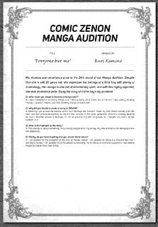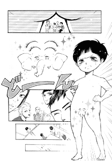 “Ms. Kamino won excellence prize in the 24th round of our Manga Audition. Despite that she is still 20 years old, she expresses the feelings of a little boy with plenty of dramaturgy. Her manga is also full of entertaining spirit, and with this highly regarded, she won excellence prize. Enjoy the story of a little boy's big problem!”