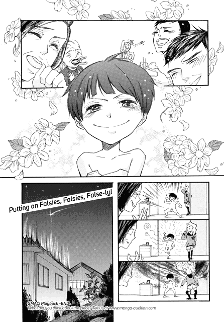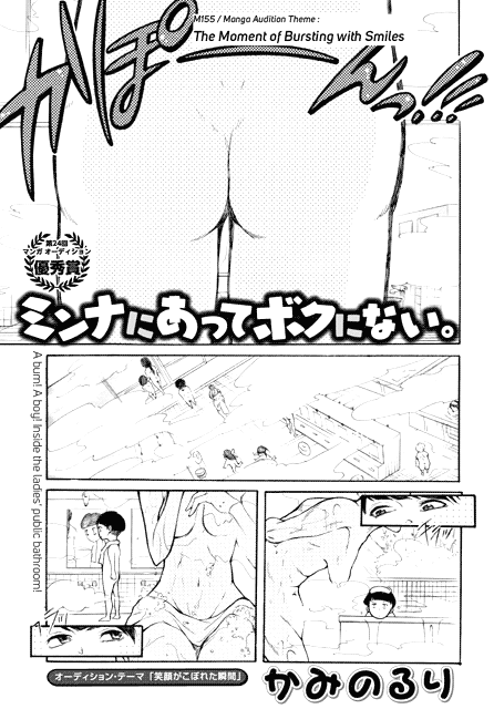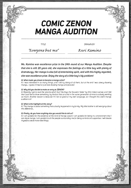 “Ms. Kamino won excellence prize in the 24th round of our Manga Audition. Despite that she is still 20 years old, she expresses the feelings of a little boy with plenty of dramaturgy. Her manga is also full of entertaining spirit, and with this highly regarded, she won excellence prize. Enjoy the story of a little boy's big problem!”