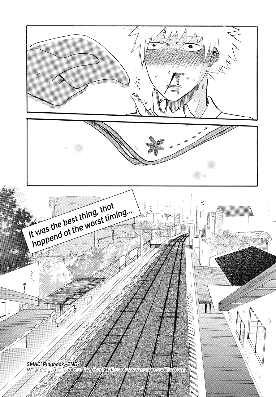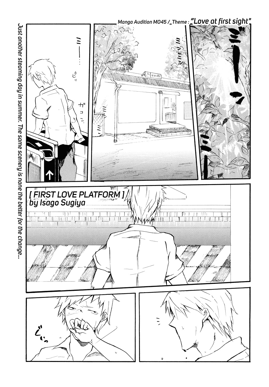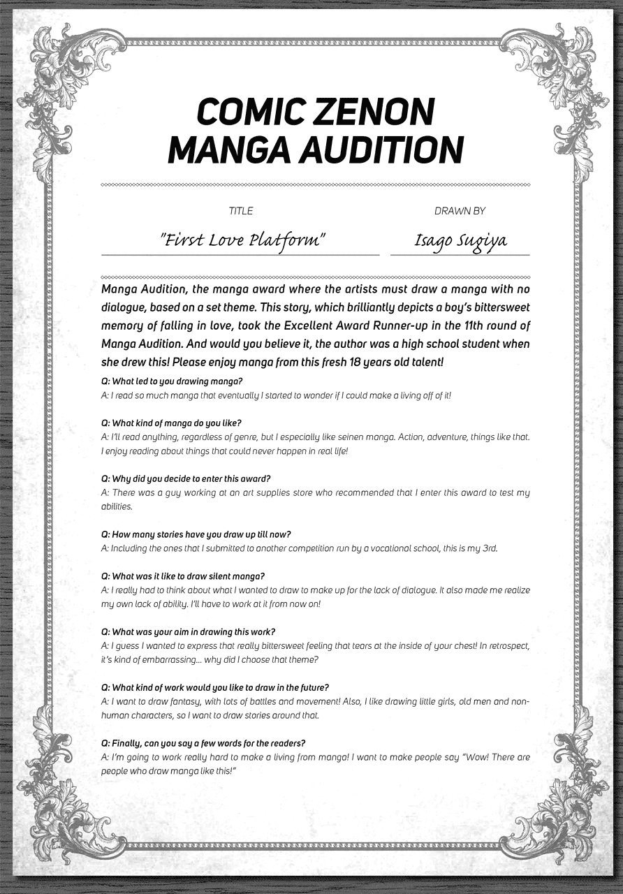 | “Manga Audition, the manga award where the artists must draw a manga with no dialogue, based on a set theme. This story, which brilliantly depicts a boy's bittersweet memory of falling in love, took the Excellent Award Runner-up in the 11th round of Manga Audition. And would you believe it, the author was a high school student when she drew this! Please enjoy this fresh 18 year old talent!” | |