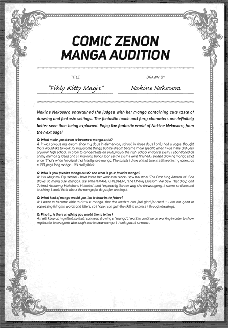 “Nakine Nekosora entertained the judges with her manga containing cute taste of drawing and fantasic settings. The fantastic touch and furry characters are definitely better seen than being explained. Enjoy the fantastic world of Nakine Nekosora, from the next page!”
