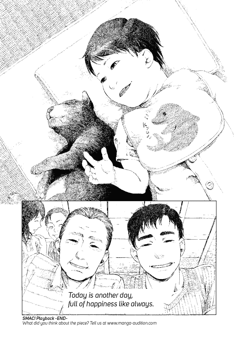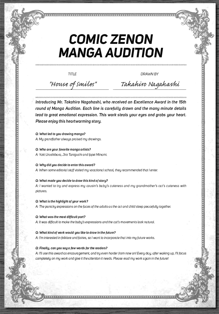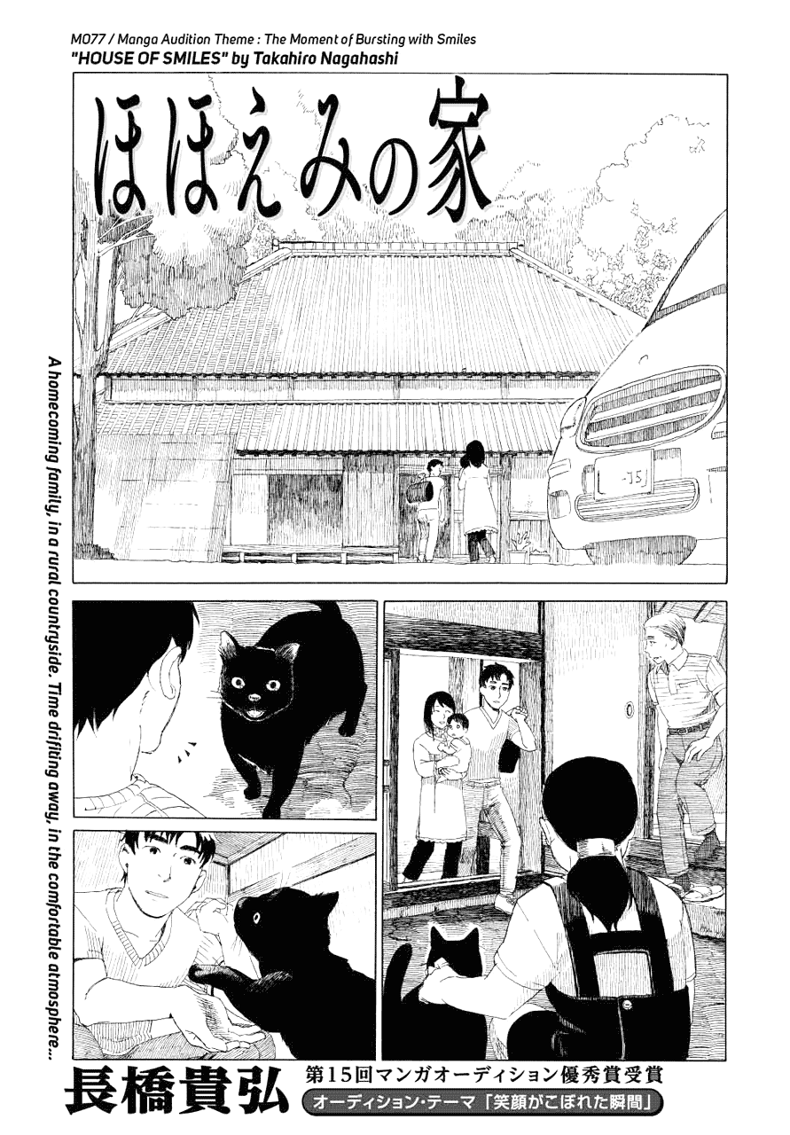 | “Introducing Mr. Takahiro Nagahashi, who received an Excellence Award in the 15th round of Manga Audition. Each line is carefully drawn and the many minute details lead to great emotional expression. This work steals your eyes and grabs your heart. Please enjoy this heartwarming story.” | |