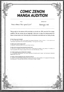 | “Tatsuya Aoi is the winner of the excellence prize for our 28th round of the manga audition. The last scene was so impactful, there was no way this manga would not leave an impression at all. Not only that, the situations are drawn out so clearly during the manga, and it is so intelligible. Don't take your eyes off from the cute but stupid heroine!!” | |