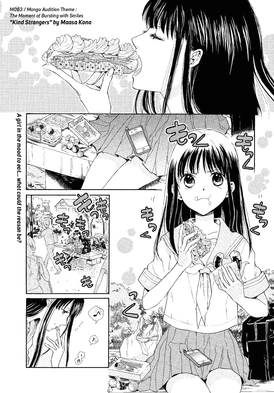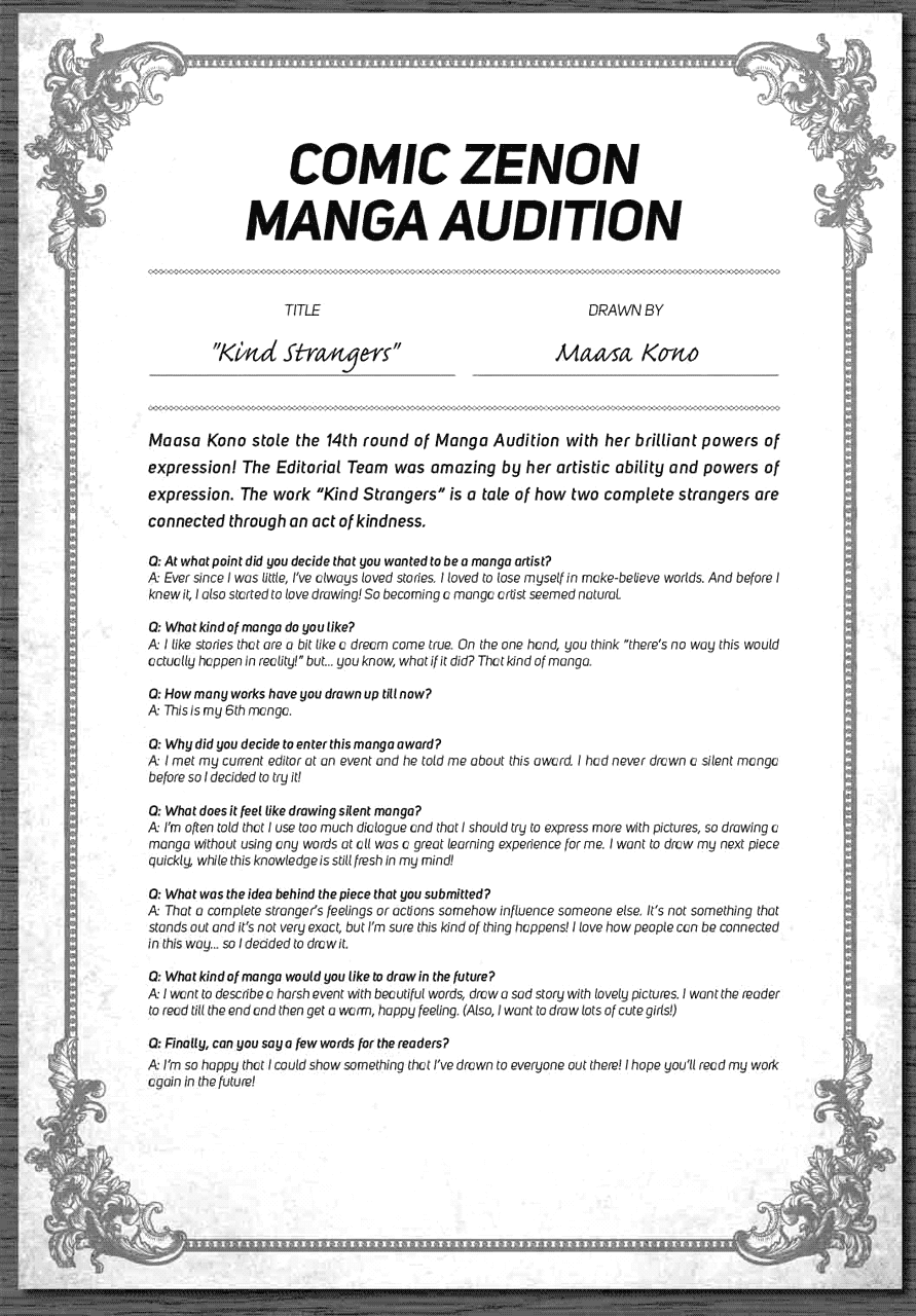 “Maasa Kono stole the 14th round of Manga Audition with her brilliant powers of expression! The Editorial Team was amazing by her artistic ability and powers of expression. The work "Kind Strangers" is a tale of how two complete strangers are connected through an act of kindness.”