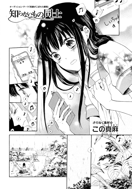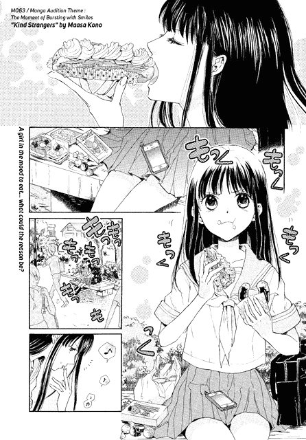 | “Maasa Kono stole the 14th round of Manga Audition with her brilliant powers of expression! The Editorial Team was amazing by her artistic ability and powers of expression. The work "Kind Strangers" is a tale of how two complete strangers are connected through an act of kindness.” | |