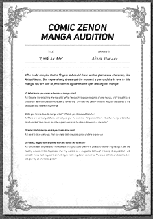 | “I am full with surprise and thankfulness that you could give me a prize and publish my manga. I feel like floating around in this happiness, that my work is on a magazine (although it is only 6 pages), but I will consider it as a half way point, and will try to make my dream come true. There are still lots of obstacles, but I will give my all and never give in!” | |