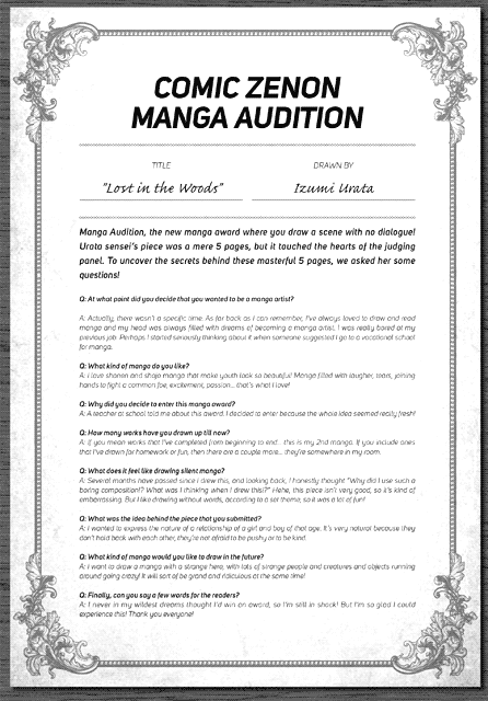 | “Manga Audition, the new manga award where you draw a scene with no dialogue! Urata sensei's piece was a mere 5 pages, but it touched the hearts of the judging panel. ” | |