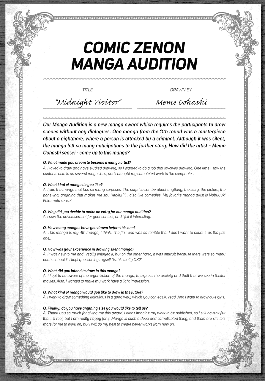 | “One manga from the 11th round was a masterpiece about a nightmare, where a person is attacked by a criminal. Although it was silent, the manga left so many anticipations to the further story.” | |