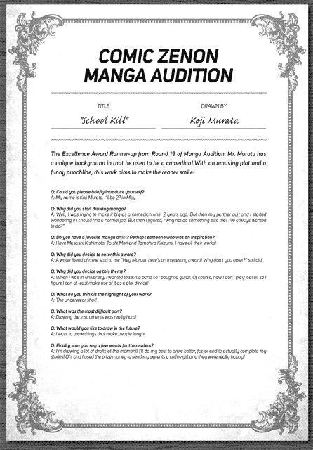 “The Excellence Award Runner-up from Round 19 of Manga Audition. Mr. Murata has a unique background in that he used to be a comedian! With an amusing plot and a funny punchline, this work aims to make the reader smile!”
