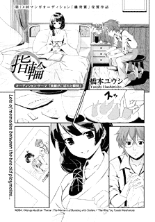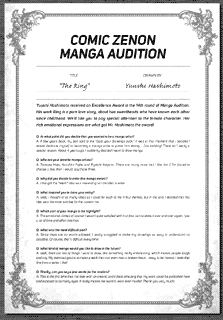 | “Yuushi Hashimoto received an Excellence Award in the 14th round of Manga Audition. His work Ring is a pure love story, about two sweethearts who have known each other since childhood. We'd like you to pay special attention to the female character. Her rich emotional expressions are what got Mr. Hashimoto the award!” | |