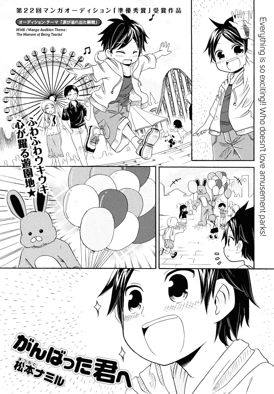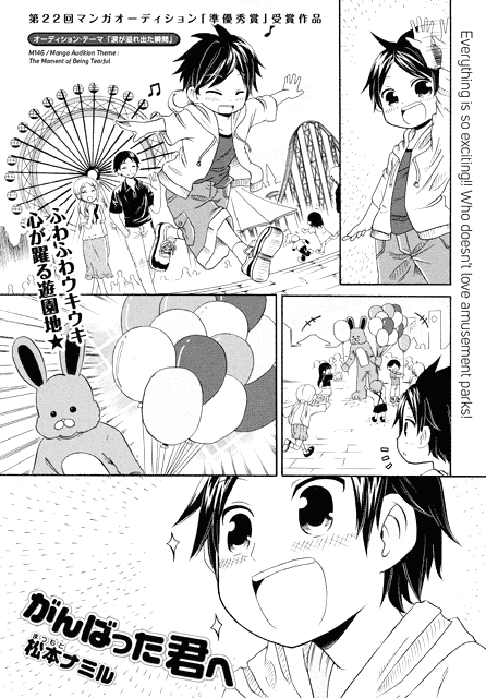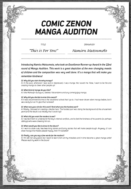 | “Introducing Namiru Matsumoto, who took an Excellence Runner-up Award in the 22nd round of Manga Audition. This work is a great depiction of the ever changing moods of children and the composition was very well done. It's a manga that will make you remember kindness!” | |