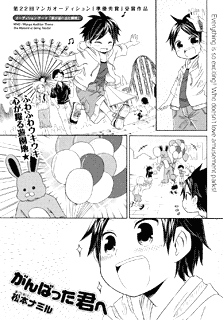 | “Introducing Namiru Matsumoto, who took an Excellence Runner-up Award in the 22nd round of Manga Audition. This work is a great depiction of the ever changing moods of children and the composition was very well done. It's a manga that will make you remember kindness!” | |