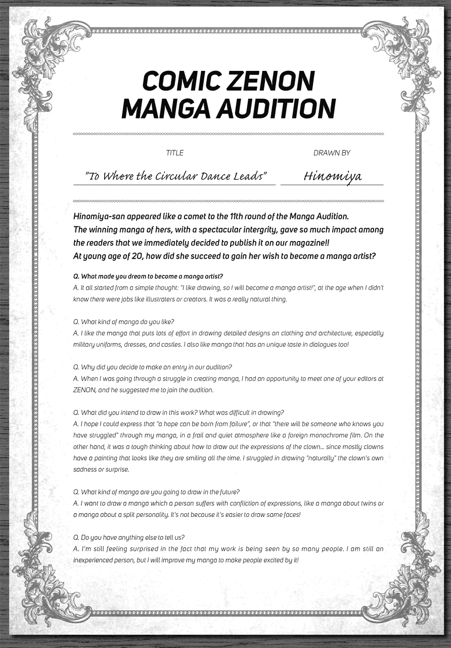 | “Hinomiya-san appeared as like a comet to the 11th round of the Manga Audition. The winning manga of hers, with a spectacular intergrity, gave so much impact among the readers that we immediately decided to publish it on our magazine!!” | |