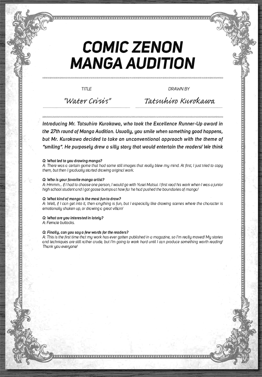 “Introducing Tatsuhiro Kurokawa, who took the Excellence Runner-Up award in the 27th round of Manga Audition. Usually, you smile when something good happens, but Kurokawa-san decided to take an unconventional approach with the theme of "smiling". He purposely drew a silly story that would entertain the readers! We think it's important to clearly explain the situation after a scene change, to make it easier for the reader to understand. The hero is a really unlucky guy, but he has a great smile! ”